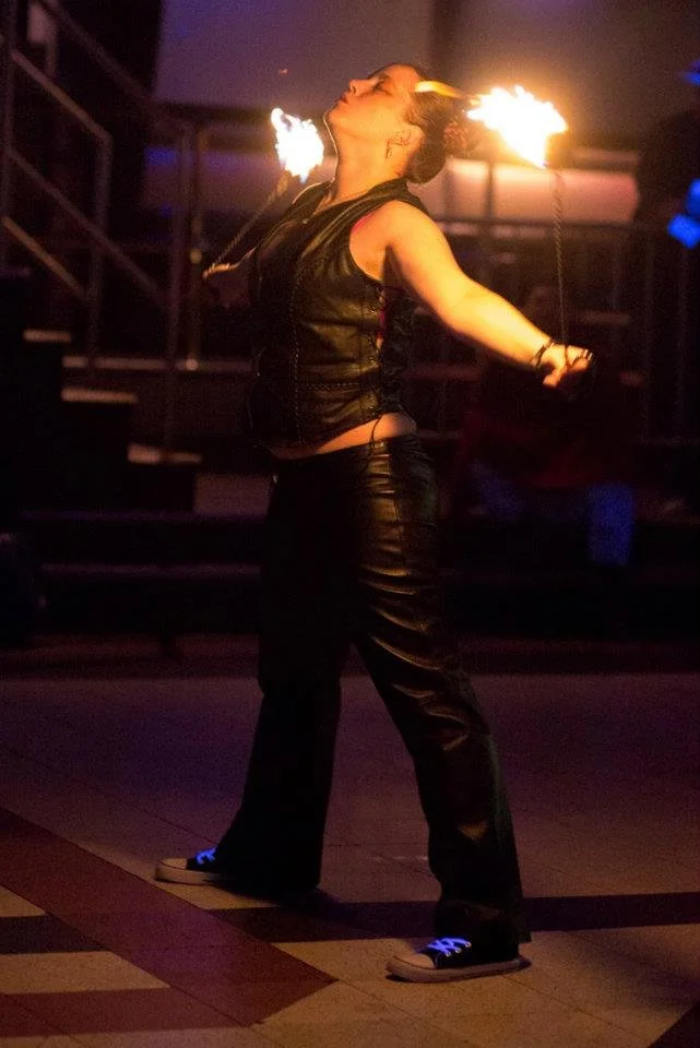 Working with fire came as a surprise. I met a traveling musician who did fire performance. She was kind enough to encourage my transfixed questions and soon after I picked up a pair of poi. Her partner then trained me in fire safety and I started playing with fire on my 24th birthday.